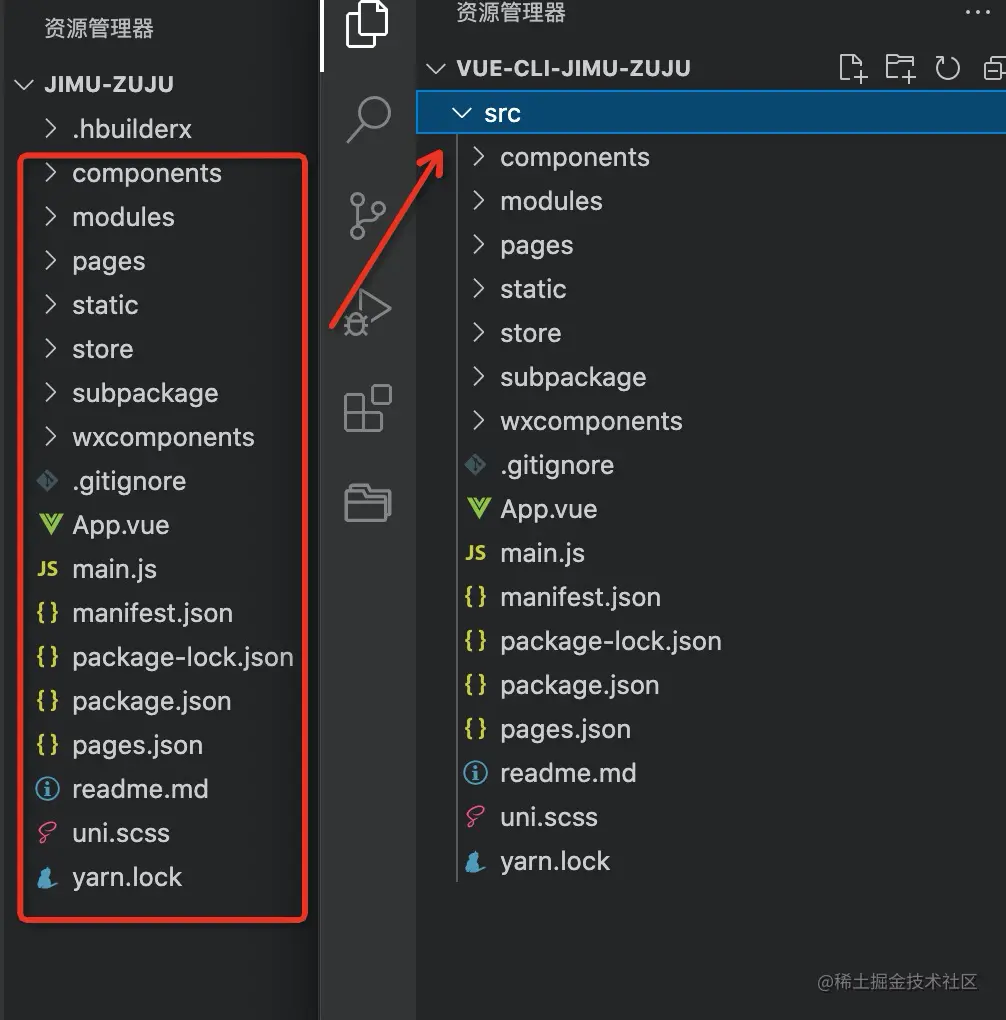 在newProject文件夹的根目录下新建src文件夹,将 HBuilderX 创建的工程项目里面所有的文件 copy 进src文件夹。