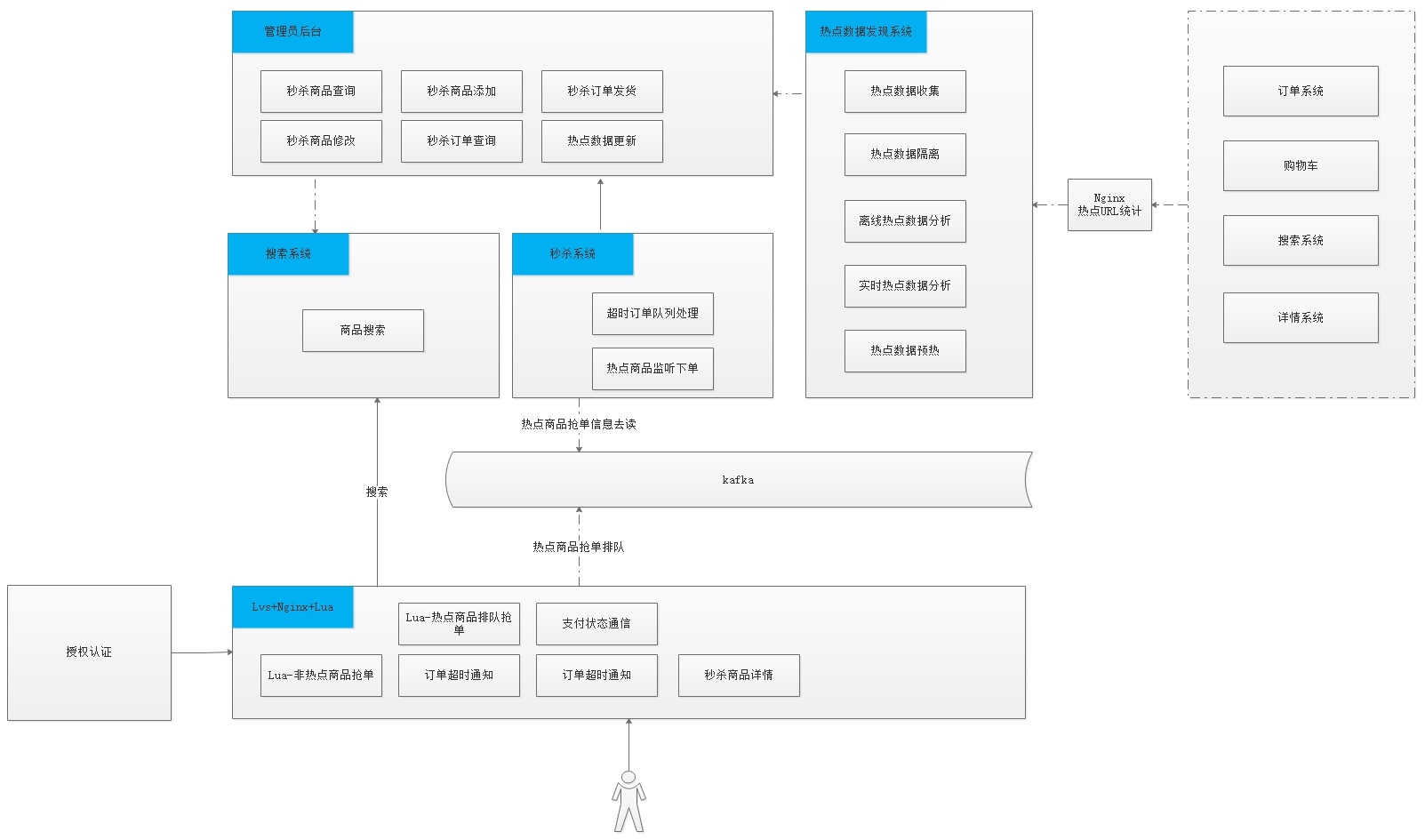 当前秒杀系统中一共涉及到管理员后台、搜索系统、秒杀系统、抢单流程系统、热点数据发现系统,如下图: