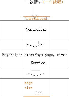 在调用dao的service方法中设置分页参数:PageHelper.startPage(page, size),分页参数会设置在ThreadLocal中