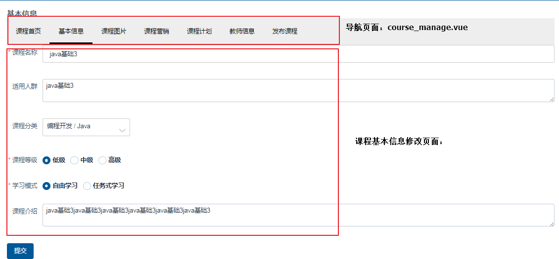 图片管理页面:course_picture.vue 营销信息页面:course_marketinfo.vue 老师信息页面:course_teacher.vue