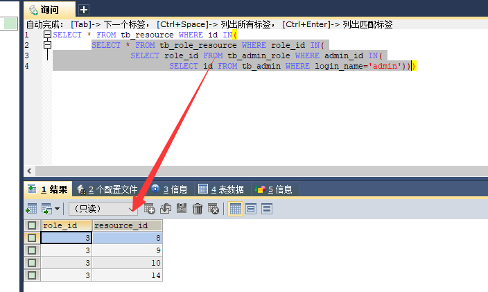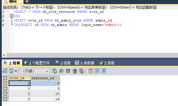 SELECT resource_id FROM tb_role_resource WHERE role_id IN(