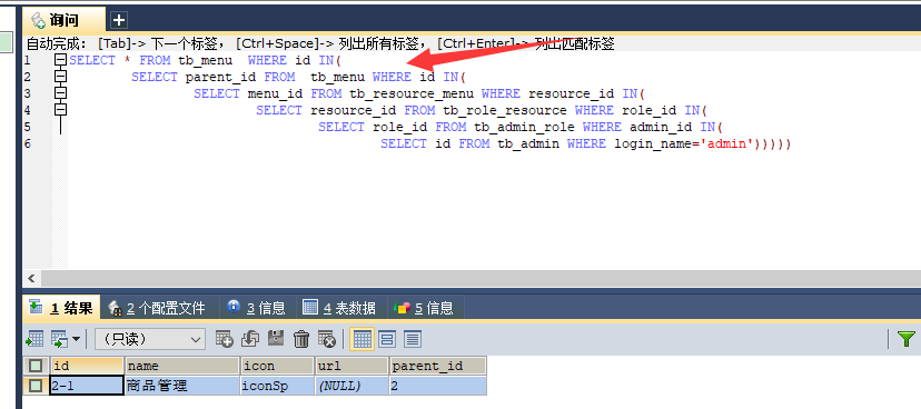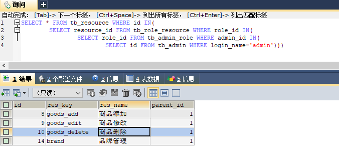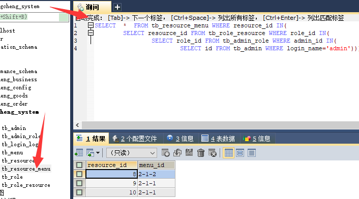 (1)编写 SQL 语句,根据当前登录名获取菜单列表的方法 根据资源 key 找到绑定的菜单 此时需要的是资源 id 而非用户权限 id,此时