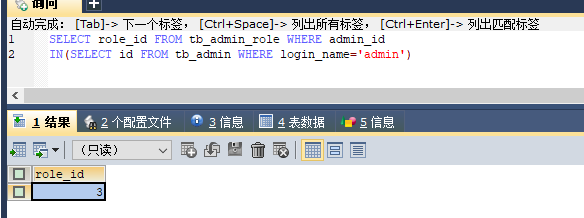 SELECT role_id FROM tb_admin_role WHERE admin_id IN(