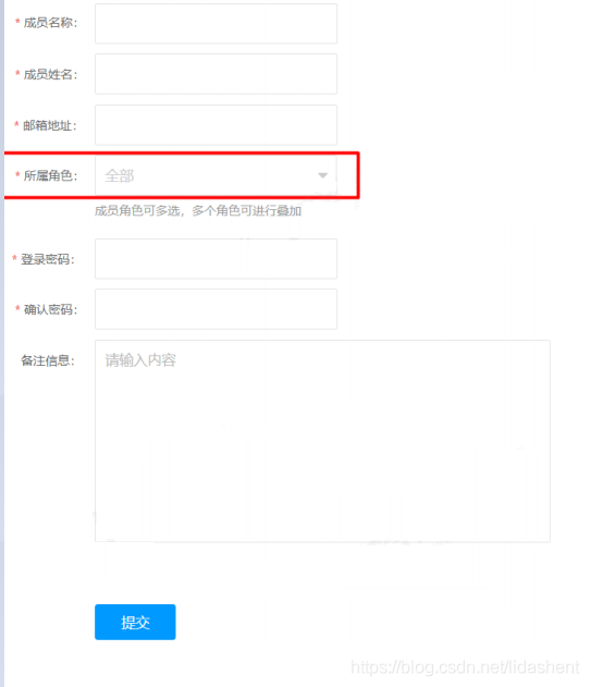 添加此注解后,可以获取新增的 id 值。 (4)修改管理员 add 方法,取出管理员实体保存,取出角色 ID 集合,循环添加到管理员 角色中间表。 (5)注意在保存管理员密码时需要对密码进行 bcrypt 加密。 (6)前端可以根据代码生成器生成的代码修改即可。“所属角色” 使用 elementui 的 select 选择器 ,为 el‐select 设置 multiple 属性即可启用多选 ,详见官方文档。