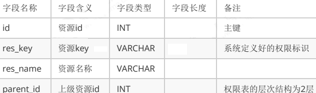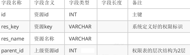 tb_resource 权限表(资源表): 一般有两层,资源 id,资源分组(一组权限点) 资源 key 代表资源标识,未来会将其标注在某个方法上,控制某个 url 后面的名字是给用户看的,代表权限名字,实际上是分配了一个资源组的 key