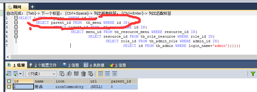 (1)编写 SQL 语句,通过登录名查询资源 KEY 列表不知道该角色拥有什么权限,查询然而没有直接的权限表,常见为嵌套查询从里向外写先根据用户名查询出用户 id