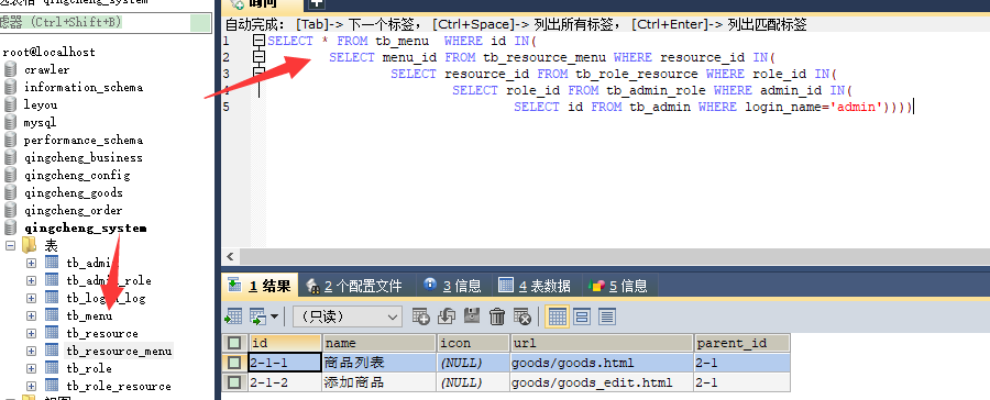 注意通过上述语句,获取的菜单列表只包含三级菜单,而我们需要返回包括一级菜单、 二级菜单和三级菜单的菜单列表。只要三级菜单存在,就要有它的二级菜单;只要有一 个二级菜单就要有它的一级菜单。 查询二级菜单列表: