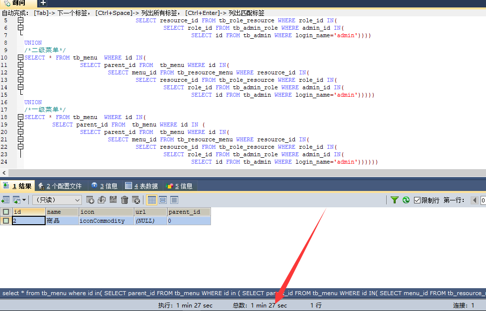 我们需要用户所对应的菜单,包括一,二,三级菜单 但是上面的数据库代码只能分开获得,鱼和熊掌不能兼得。 因此要分别写三个语句,然后 union 联合一下, 就相当于一条语句,可以同时得出三个菜单