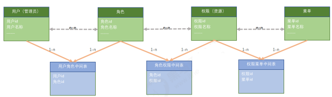 用户和角色为多对多关系,通过用户角色中间表关联 tb_admin 管理员表: