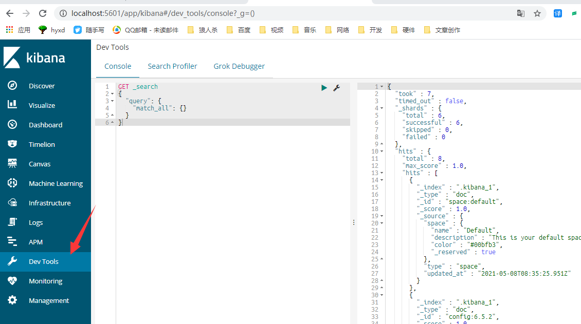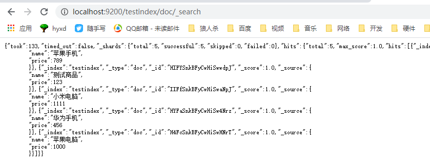 查询某索引某类型的全部数据,以 get 方式请求 http://127.0.0.1:9200/testindex/doc/_search 返回结果如下: