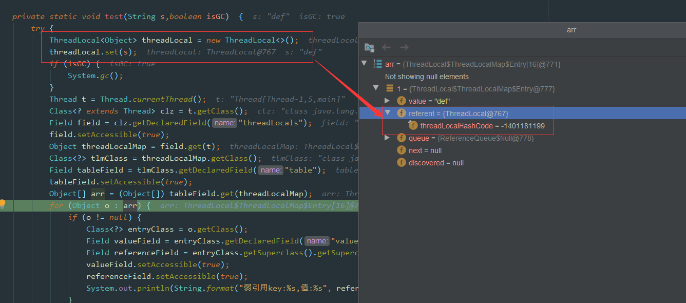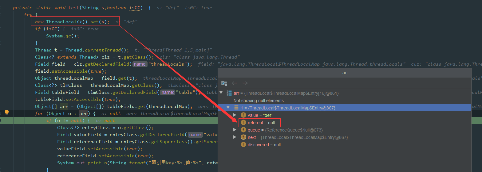 new ThreadLocal<>().set(s);所以这里在GC之后,key就会被回收,我们看到上面debug中的referent=null, 如果改动一下代码: