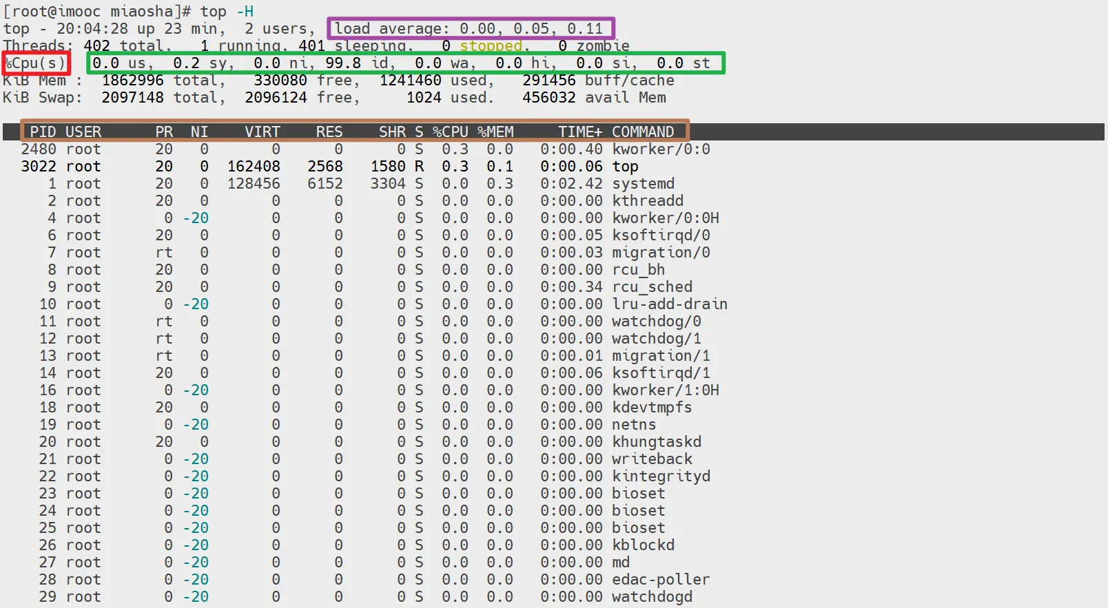 统计信息区前五行是系统整体的统计信息。第一行是任务队列信息,同 uptime 命令的执行结果。其内容如下: