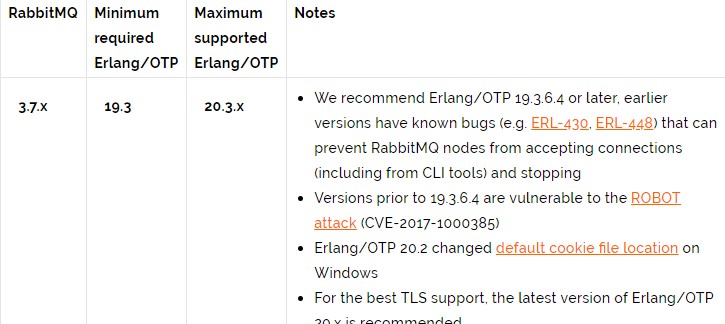 RabbitMQ由Erlang语言开发,Erlang语言用于并发及分布式系统的开发,在电信领域应用广泛,OTP(Open Telecom Platform)作为Erlang语言的一部分,包含了很多基于Erlang开发的中间件及工具库,安装RabbitMQ需要安装Erlang/OTP,并保持版本匹配,如下图: