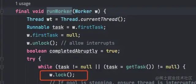 基于 AQS 的 acquire()、tryAcquire() 实现了 lock()、tryLock() 方法,类上也有注释,该锁主要是用来维护运行中线程的中断状态。在 runWorker() 方法中以及刚说的 interruptIdleWorkers() 方法中用到了。