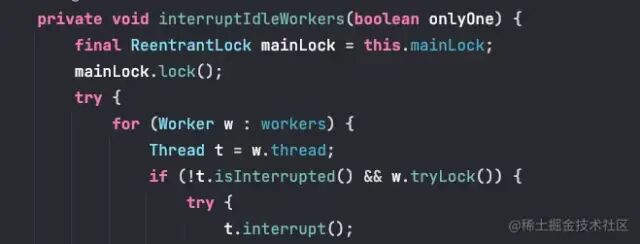 其实简单理解就是如果不加锁,interruptIdleWorkers() 方法在多线程访问下就会发生这种情况。一个线程调用 interruptIdleWorkers() 方法对 Worker 进行中断,此时该 Worker 出于中断中状态,此时又来一个线程去中断正在中断中的 Worker 线程,这就是所谓的中断风暴。