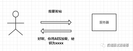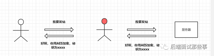 这个时候可能就有人想到了,既然内容是明文那我使用对称加密的方式将报文加密这样中间人不就看不到明文了吗,于是如下改造: