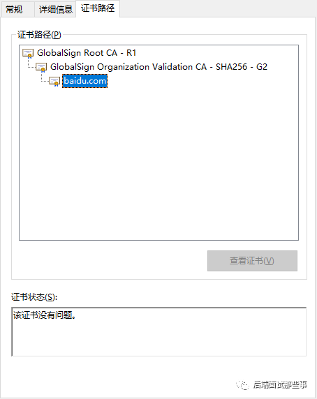 可以看到百度是受信于GlobalSign G2,同样的GlobalSign G2是受信于GlobalSign R1,当客户端 (浏览器) 做证书校验时,会一级一级的向上做检查,直到最后的根证书,如果没有问题说明服务器证书是可以被信任的。