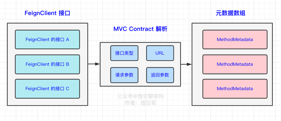 解析 FeignClient 接口上各个方法级别的注解,比如远程接口的 URL、接口类型(Get、Post 等)、各个请求参数等。这里用到了 MVC Contract 协议解析,后面会讲到。