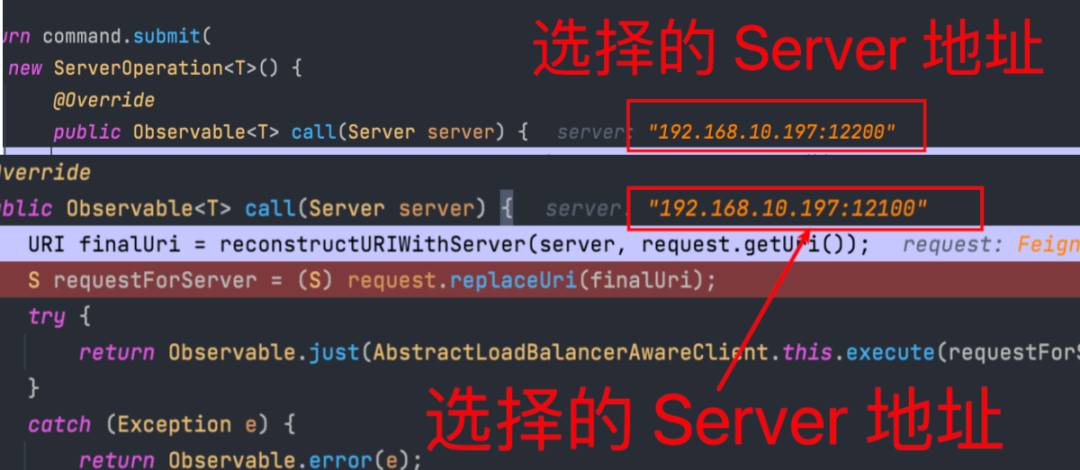 submit 方法里面就会用 Ribbon 的负载均衡算法选择一个 server。源码如下:
