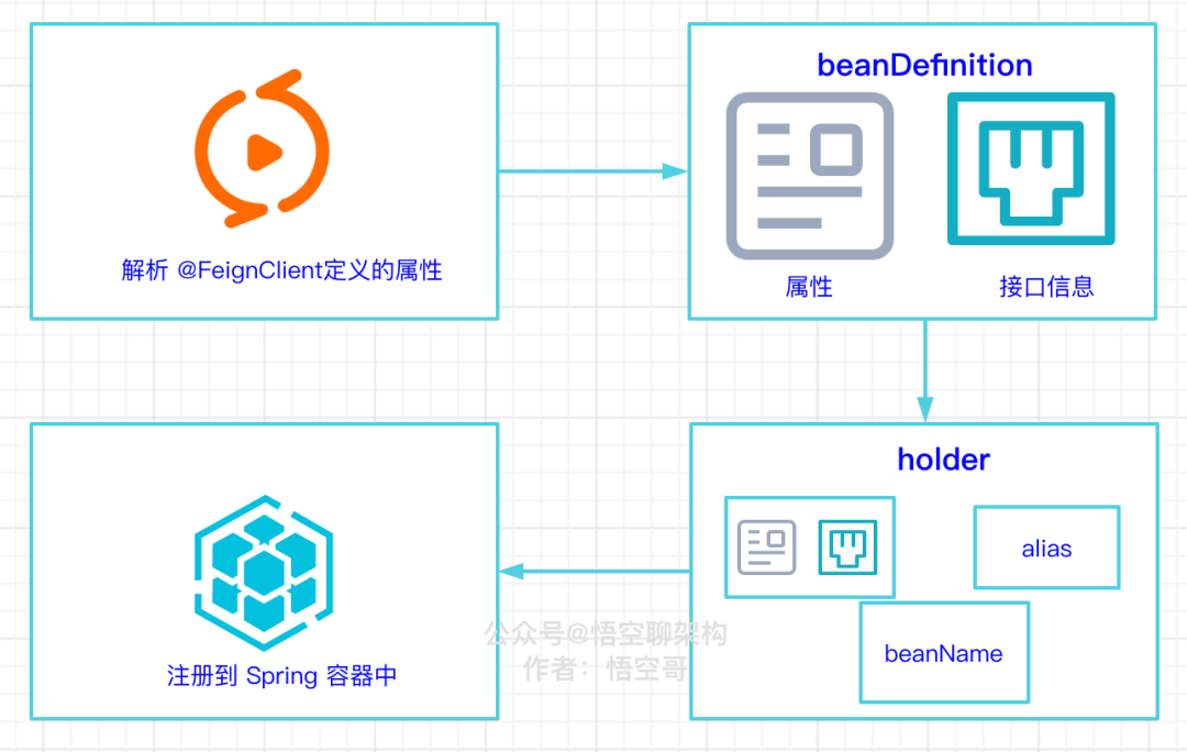 我们最开始用的 @FeignClient,里面有个参数 “passjava-study”,这个是注解的属性,当 OpenFeign 框架去创建 FeignClient Bean 的时候,就会使用这些参数去生成 Bean。流程图如下: