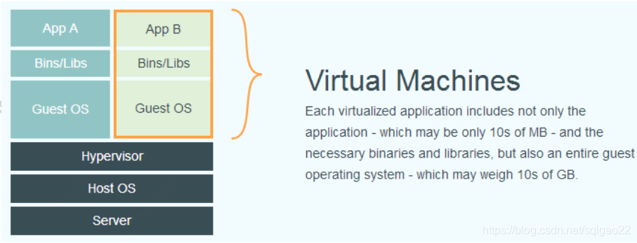 我们用的传统虚拟机就是在硬件级别进行的虚拟化. 例如 VMware , VisualBox 之类的需要模拟整台机器包括硬件,每台虚拟机都需要有自己的操作系统,虚拟机一旦被开启,预分配给它的资源将全部被占用。每一台虚拟机包括应用,必要的二进制和库,以及一个完整的用户操作系统。