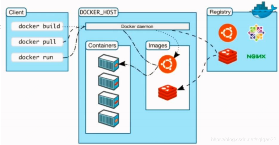 启动一个 dockerClient → 拉取 docker 镜像 (images) → 启动镜像得到一个容器 (contain) → 容器中就是我们的程序.