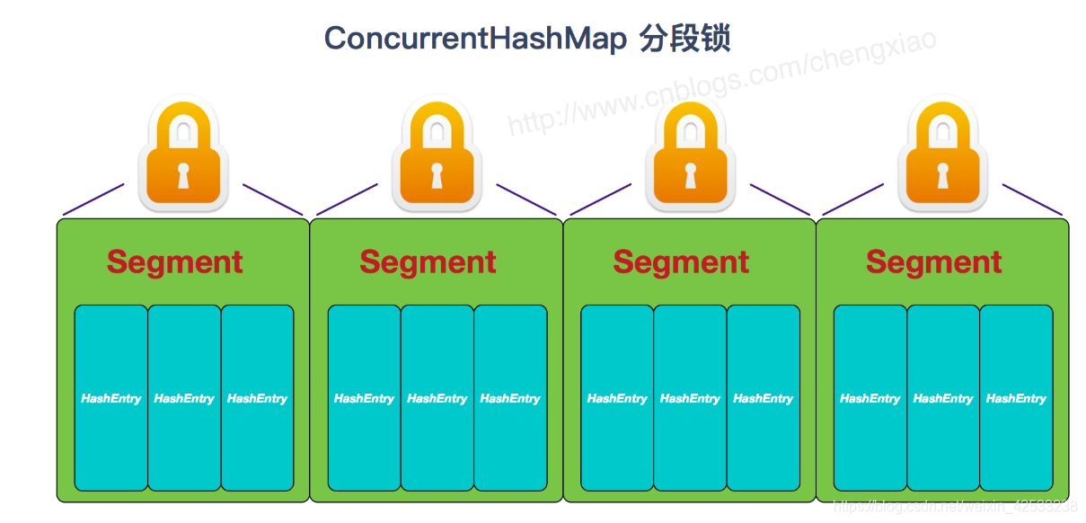 Map 类似,是一种数组和链表结构,一个 Segment 包含一个 HashEntry 数组,每个 HashEntry 是一个链表结构的元素,每个 Segment 守护着一个 HashEntry 数组里的元素,当对 HashEntry 数组的数据进行修改时,必须首先获得对应的 Segment 的锁。