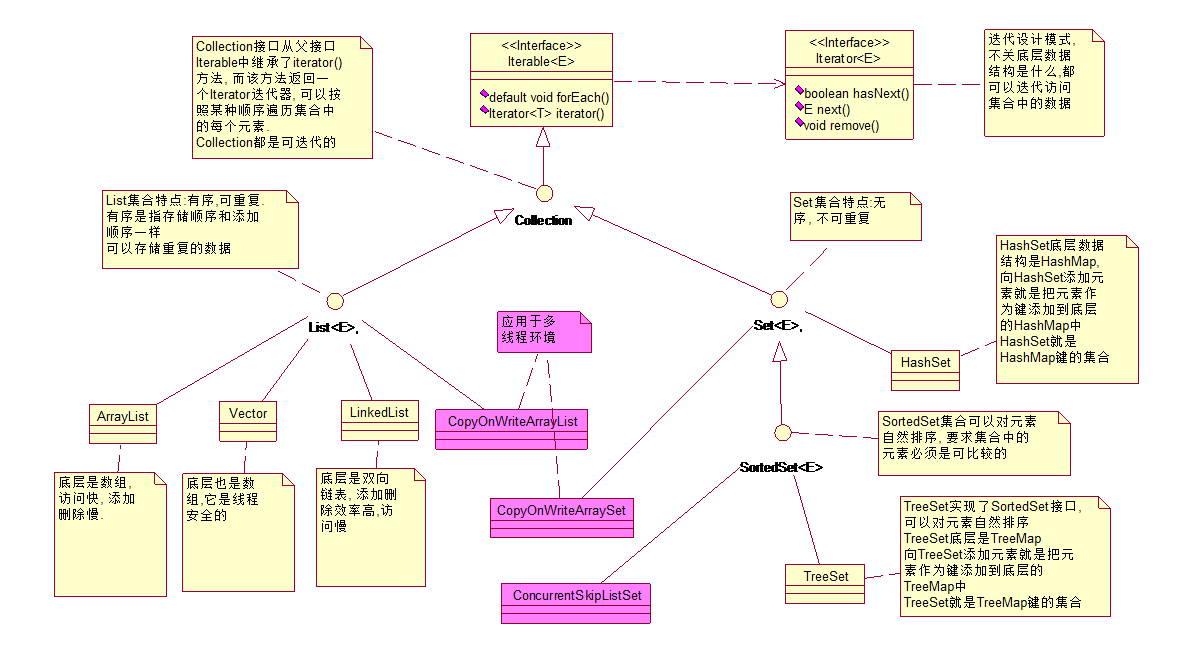 Collection 接口的接口 对象的集合(单列集合) ├——-List 接口:元素按进入先后有序保存,可重复 │—————-├ LinkedList 接口实现类, 链表, 插入删除, 没有同步, 线程不安全 │—————-├ ArrayList 接口实现类, 数组, 随机访问, 没有同步, 线程不安全 │—————-└ Vector 接口实现类 数组, 同步, 线程安全 │ ———————-└ Stack 是 Vector 类的实现类 └——-Set 接口: 仅接收一次,无序不可重复,并做内部排序 ├—————-└HashSet 使用 hash 表(数组)存储元素 │————————└ LinkedHashSet 链表维护元素的插入次序 └ —————-TreeSet 底层实现为二叉树,元素排好序