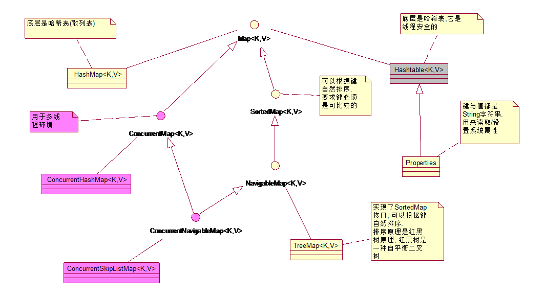 Map 接口 键值对的集合 (双列集合) ├———Hashtable 接口实现类, 同步, 线程安全 ├———HashMap 接口实现类 ,没有同步, 线程不安全 - │—————–├ LinkedHashMap 双向链表和哈希表实现 │—————–└ WeakHashMap ├ ——–TreeMap 红黑树对所有的 key 进行排序 └———IdentifyHashMap