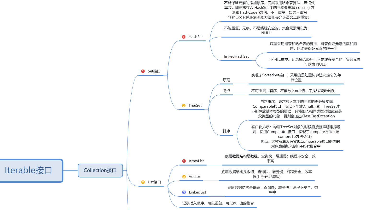 - TreeSet:底层数据结构采用红黑树来实现,元素唯一且已经排好序;唯一性同样需要重写 hashCode 和 equals() 方法,二叉树结构保证了元素的有序性。根据构造方法不同,分为自然排序(无参构造)和比较器排序(有参构造),自然排序要求元素必须实现 Compareable 接口,并重写里面的 compareTo() 方法,元素通过比较返回的 int 值来判断排序序列,返回 0 说明两个对象相同,不需要存储;比较器排序需要在 TreeSet 初始化是时候传入一个实现 Comparator 接口的比较器对象,或者采用匿名内部类的方式 new 一个 Comparator 对象,重写里面的 compare() 方法;