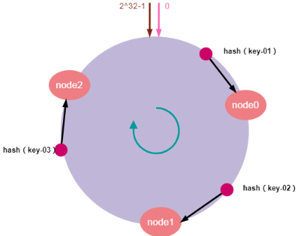 如上图所示,通过哈希计算后,key-01 顺时针寻找将找到 node0,key-02 顺时针寻找将找到 node1,key-03 顺时针寻找将找到 node2。最后,请求找到的服务器节点执行具体的业务操作。