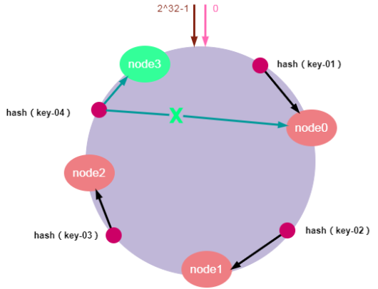 服务器缩容就是减少集群中服务器节点的数量或是集群中某个节点故障。假设,集群中的某个节点故障,原本映射到该节点的请求,会找到哈希环中的下一个节点,数据也同样被重新分配至下一个节点,其它节点的数据和请求不受任何影响。这样就确保节点发生故障时,集群能保持正常稳定。如下图所示:
