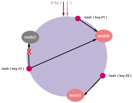 如上图所示:节点 node2 发生故障时,数据 key-01 和 key-02 不会受到影响,只有 key-03 的请求被重定位到 node0。在一致性哈希算法中,如果某个节点宕机不可用了,那么受影响的数据仅仅是会寻址到此节点和前一节点之间的数据。其他哈希环上的数据不会受到影响。