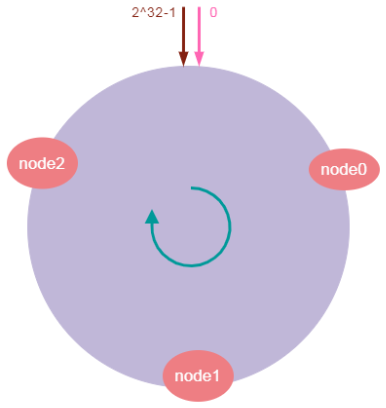 接下来,将服务器节点映射到哈希环上对应的位置。我们可以对服务器 IP 地址进行哈希计算,哈希计算后的结果对 2^32 取模,结果一定是一个 0 到 2^32-1 之间的整数。最后将这个整数映射在哈希环上,整数的值就代表了一个服务器节点的在哈希环上的位置。即:hash(服务器 ip)% 2^32。下面我们依次将 node0、node1、node2 三个缓存服务器映射到哈希环上,如下图所示: