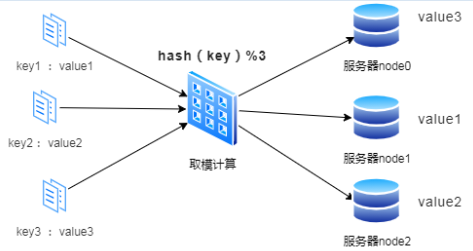 如上图所示,首先对 key 进行 hash 计算后的结果对 3 取模,得到的结果一定是 0、1 或者 2;然后映射对应的服务器 node0、node1、node2,最后直接找对应的服务器存取数据即可。