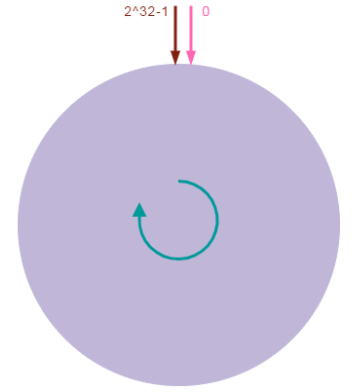 首先,一致性哈希算法将整个哈希值空间映射成一个虚拟的圆环。整个哈希空间的取值范围为 02^32-1,按顺时针方向开始从 02^32-1 排列,最后的节点 2^32-1 在 0 开始位置重合,形成一个虚拟的圆环。如下图所示: