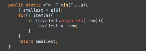 }在这段代码,大家可能会疑惑为什么把 T 也填充为 StringCompare 类型,记得我们上面说的吗:smallest.compareTo(item),smallest 和 item 是同一类型!!所以 compareTo 的参数必须是与调用者自身是同一类型,所以要把 T 填充为 StringCompare; 在这段代码中 compareTo 的实现为,对比当前 mstr 的长度与传进来实例的 mstr 长度进行比较,如果超过,则返回 true, 否则返回 false; 最后是使用 min 函数: