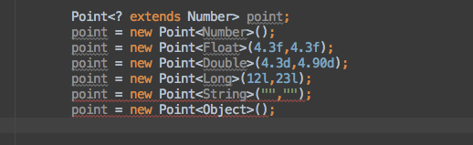 point = new Point<Long>(12l,23l);在这里,我们首先,利用下面的代码生成一个 point 实例,注意到,在填充泛型时,用的是?