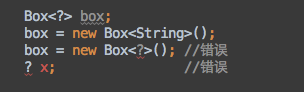 box = new Box<String>();即填充泛型变量 T 的位置,不能出现在后面 String 的位置!!!! 下面的第三行,第四行,都是错误的。通配符不能用于定义变量。
