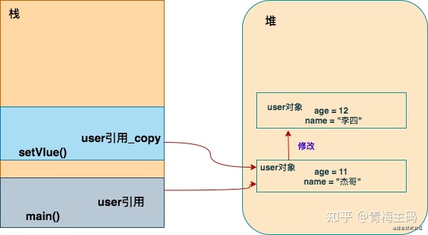而,我们这里实际上也是把 user 复制了一份到 setValue()函数中,这里的值实际上是 user 的对象引用,只 copy 了引用,也就是地址,但是他们所指向的内容,却依旧是同一份,java 中并不会为你再创建一份,那么,直接修改了这些内容,那么原来的 user 对象的值肯定也就发生了改变