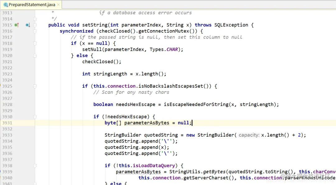 打开 PreparedStatement 类的 setString() 方法(MyBatis 在#{}传递参数时,是借助 setString() 方法来完成,${}则不是):
