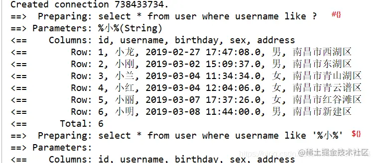 通过上面的 SQL 语句我们能够发现#{}是会加上双引号,而${}匹配的是真实的值。