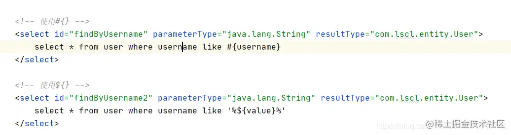 <select id="findByUsername" parameterType="java.lang.String" resultType="com.lscl.entity.User">