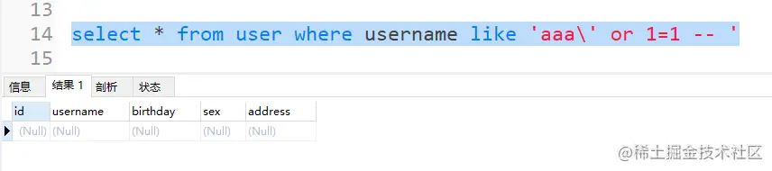 咱们在数据库中执行如下 SQL 语句(肯定是查询不到数据的):