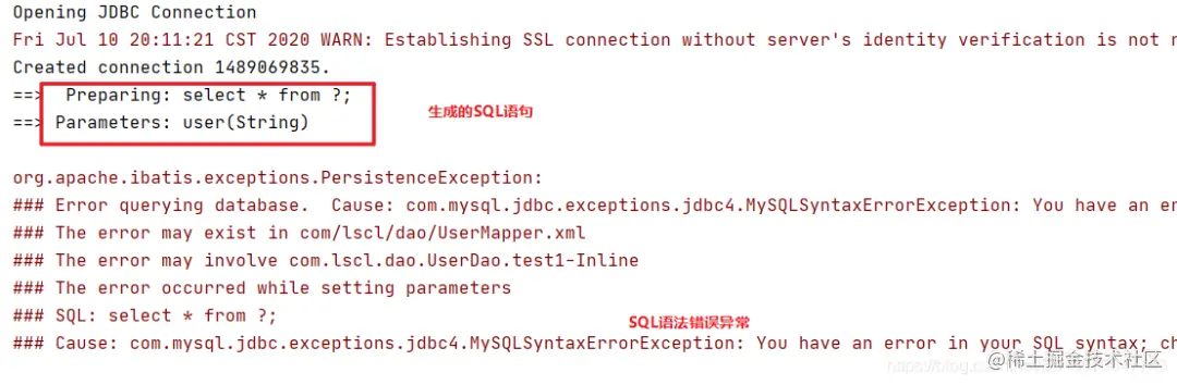我们可以切换一下,把${}改成#{},会出现 SQL 语法错误的异常