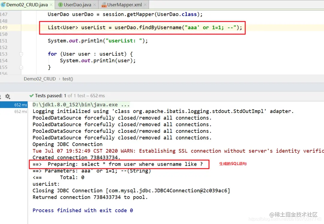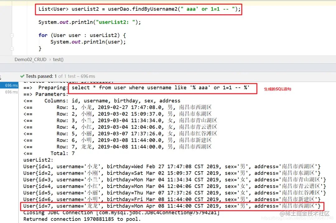 List<User> userList2 = userDao.findByUsername2(" aaa' or 1=1 -- ");