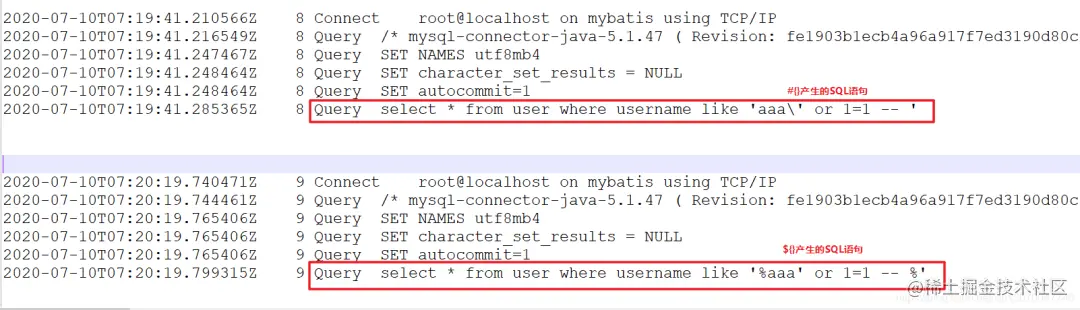 我们也可以通过 MySQL 的日志来观察#{}和${}产生的 SQL 语句来分析问题: