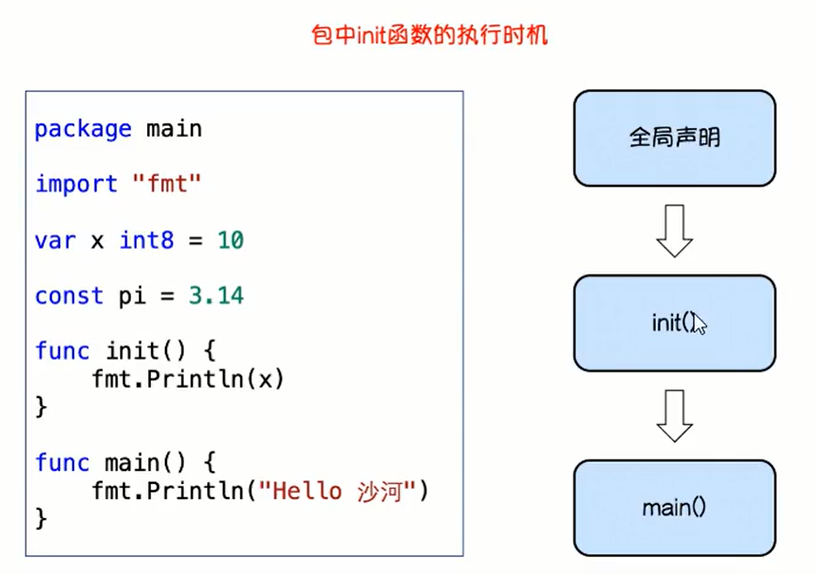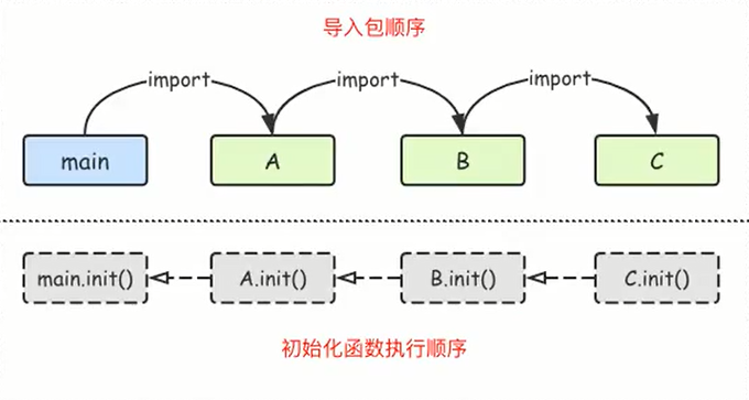 在 Go 语言程序执行时导入包语句会自动触发包内部 init() 函数的调用。 需要注意的是:init()函数没有参数,也没有返回值。 init()函数在程序运行时,自动自动被调用执行,不能在代码中主动调用它。 包初始化执行的顺序如下图所示: