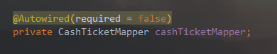 这样就不会有警告了。原因很好理解:IDEA 认为 cashTicketMapper 是个 null,给了警告;加上 required = false 后,使用 @Autowired 注解不再去校验 userMapper 是否存在了,也就不会有警告了。