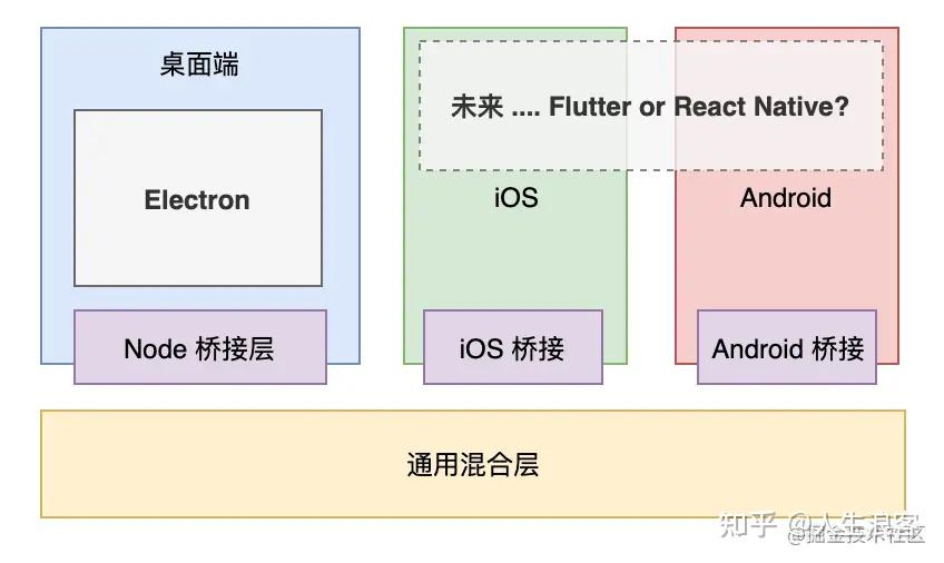 • C — 平台桥接层。介于 M 和 V 之间,桥接通用混合层接口,同时也为 UI 层暴露一些平台相关的特性。比如在桌面端,这里会通过 Node 原生模块桥接通用混合层, 同时也补充一些 Electron 缺失或不完美的功能。